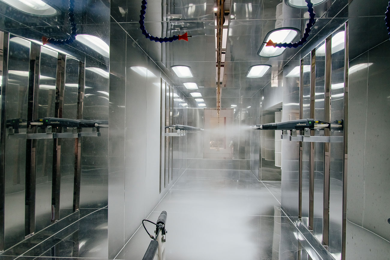 Steel radiators LEMAX Premium are coloured with paint spraying in the electrostatic field. This method consists in the directed motion of paint granules along the lines of the electrostatic field, which guarantees maximum transfer of particles to the material, the stable ink anchorage of the paint to the surface. The process is completed by the polymerization of the paint in the oven at a temperature of 160 °C. The German painting equipment is used for electrostatic paint spraying. Coating LEMAX Premium radiators a unique powder epoxy-polyester paint is used.